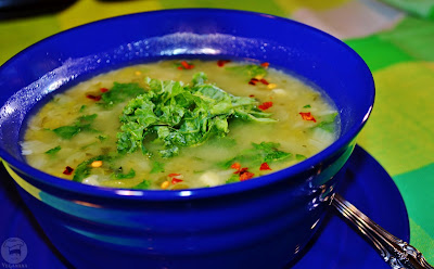 In a skillet, add a dash of oil and sauté the crushed garlic with a pinch of salt. Add chopped scallions, turn off the heat and add these ingredients to the soup pan, whisking them well. Lastly, add the kale, hand-ripped into big pieces. Cover the pan, turn off the heat and leave it for 3 minutes before serving, just to warm the kale.